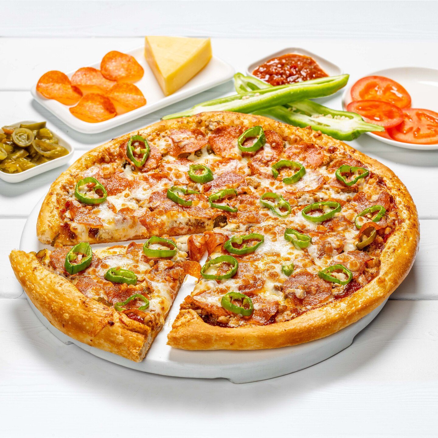 Пицца «Бруклин» — это идеальное блюдо для любителей острых ощущений. Сочный мясной фарш, обжаренный с луком, сочетается с пикантной колбасой пеперони, соусом барбекю, острым зелёным перцем и перчиком халапеньо. Откройте для себя новые грани вкуса!