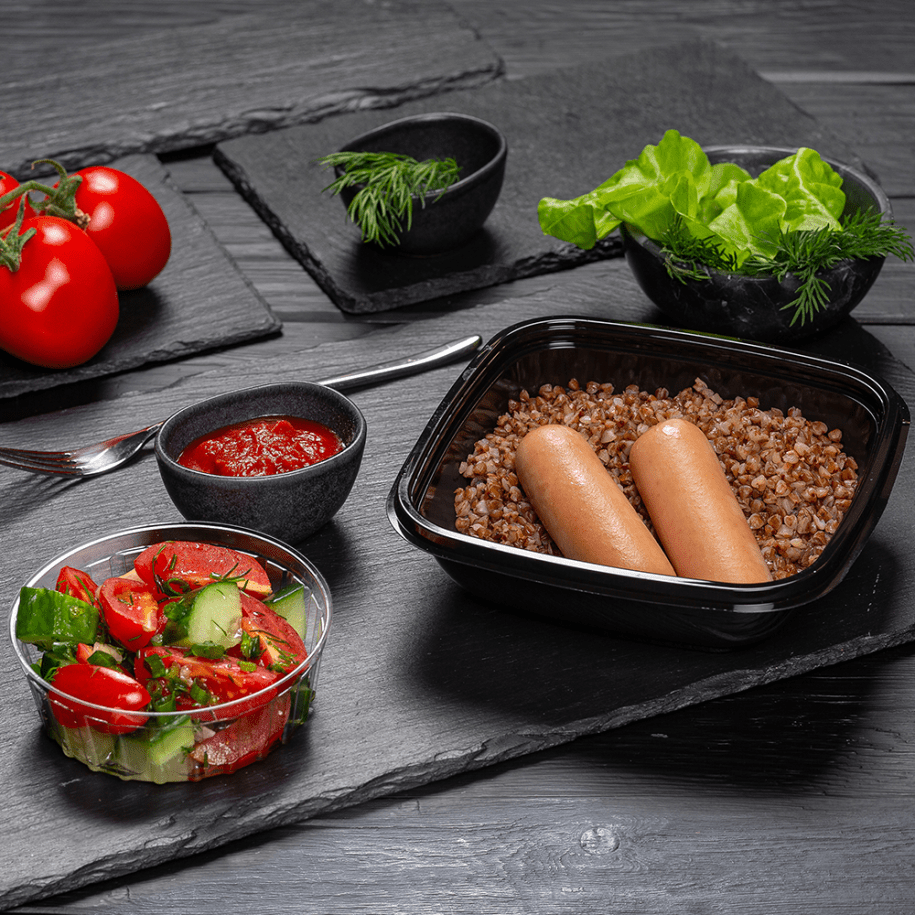 сосиски отварные, гречка отварная (гречка, масло растительное, соль); закуска из свежих овощей (помидоры черри св., огурцы св., масло растительное), соус красный (томат-паста, помидоры свеж., масло растительное, сахар, соль, базилик суш., орегано суш.)