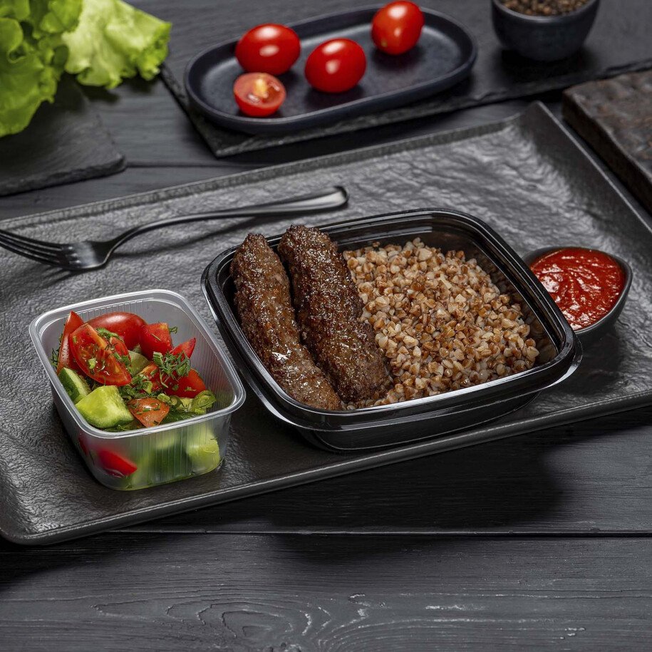 Удлинённая румяная мясная котлета из говяжьего фарша подаётся с гарниром из рассыпчатой гречки, пикантным красным соусом и салатной закуской из помидорок черри, свежих огурцов и зелени.