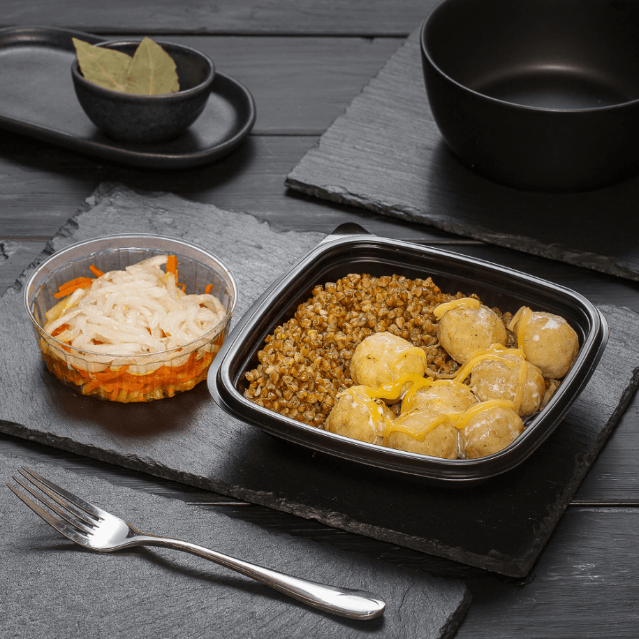 Куриные тефтели: филе курицы измельчен., лук репчатый, сухари пшеничные, молоко сухое, соль, специи, соус сливочный: сливки, сыр; Гречка отварная: гречка, масло растительное, соль; Закуска из дайкона: дайкон свежий, морковь свежая, масло растительное, чеснок св., соль, сахар, кориандр, уксус 9%
