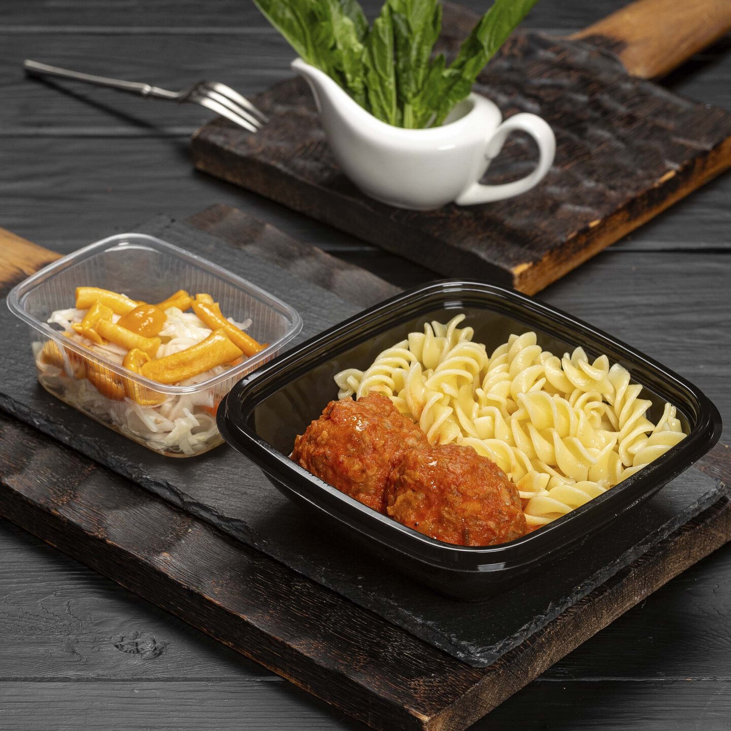Ёжики мясные в томатно-сметанном соусе с макаронами и закуской из маринованной капусты с опятами