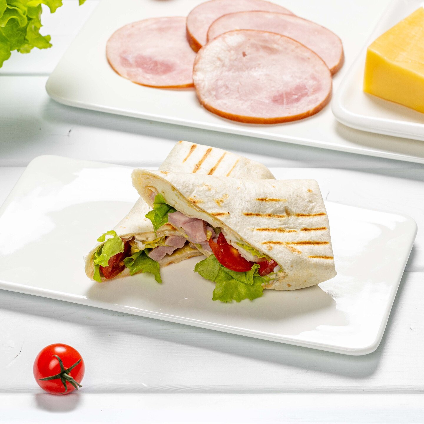 лепешка пшеничная, ветчина, помидоры черри, соус Ранч (майонез, сыворотка, чеснок суш., лимонная кислота, паприка, петрушка суш., перец ч/молот), сыр моцарелла, лист салата