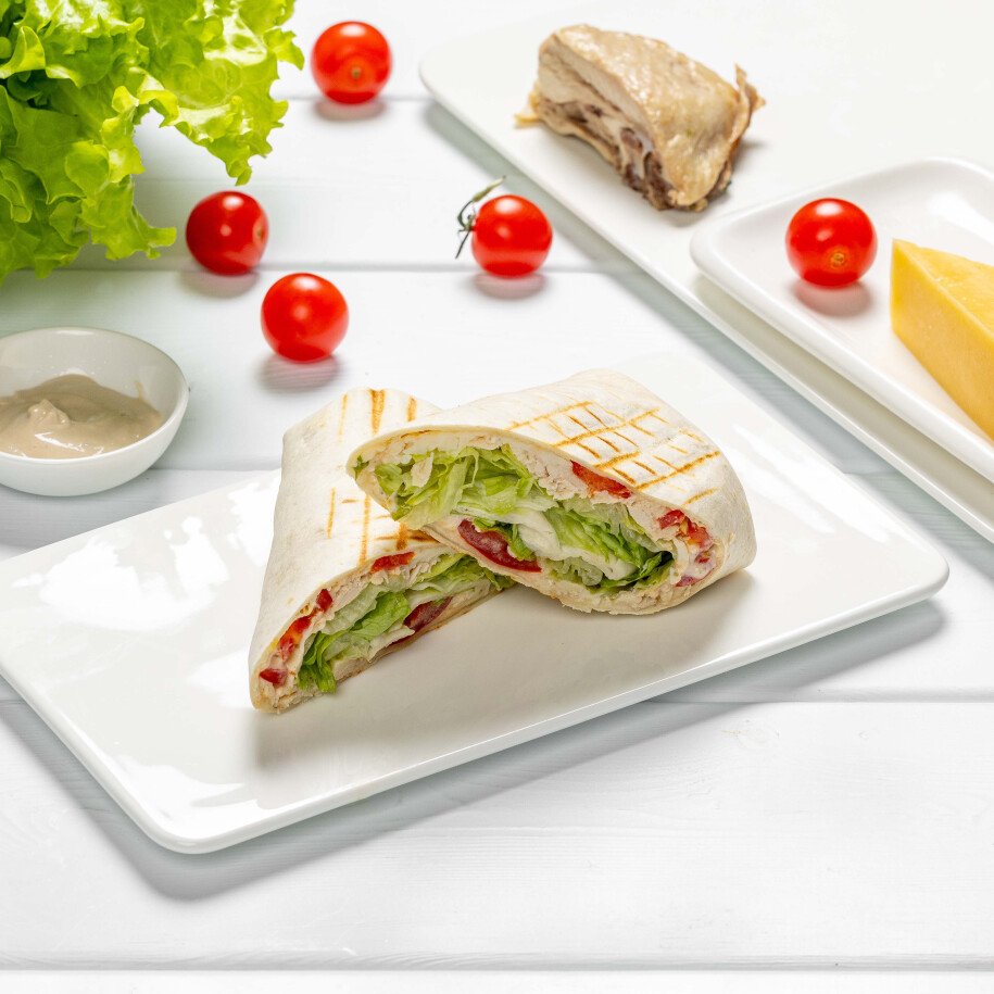 Ароматная пшеничная лепёшка с популярной начинкой цезарь: запечённая куриная грудка, помидорки черри, листовой салат, сыр, соус.