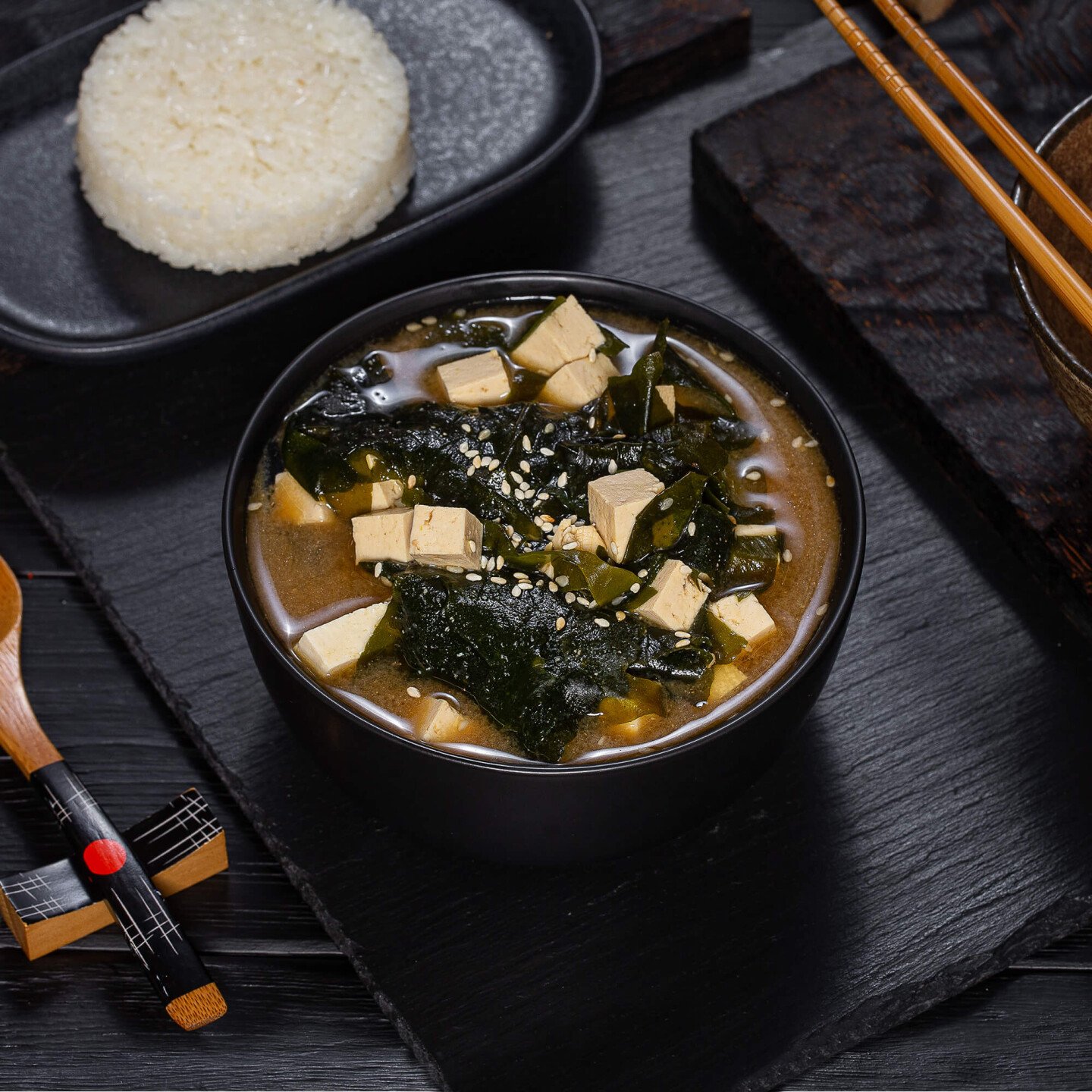 паста мисо, сыр тоффу, водоросли вакамэ, специи, рис отварной