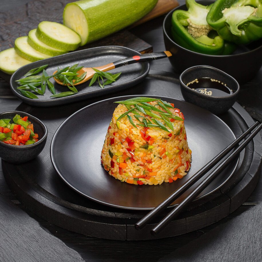 Рис, перец болгарский, цукини, лук репчатый, морковь св., масло растительное, специи
