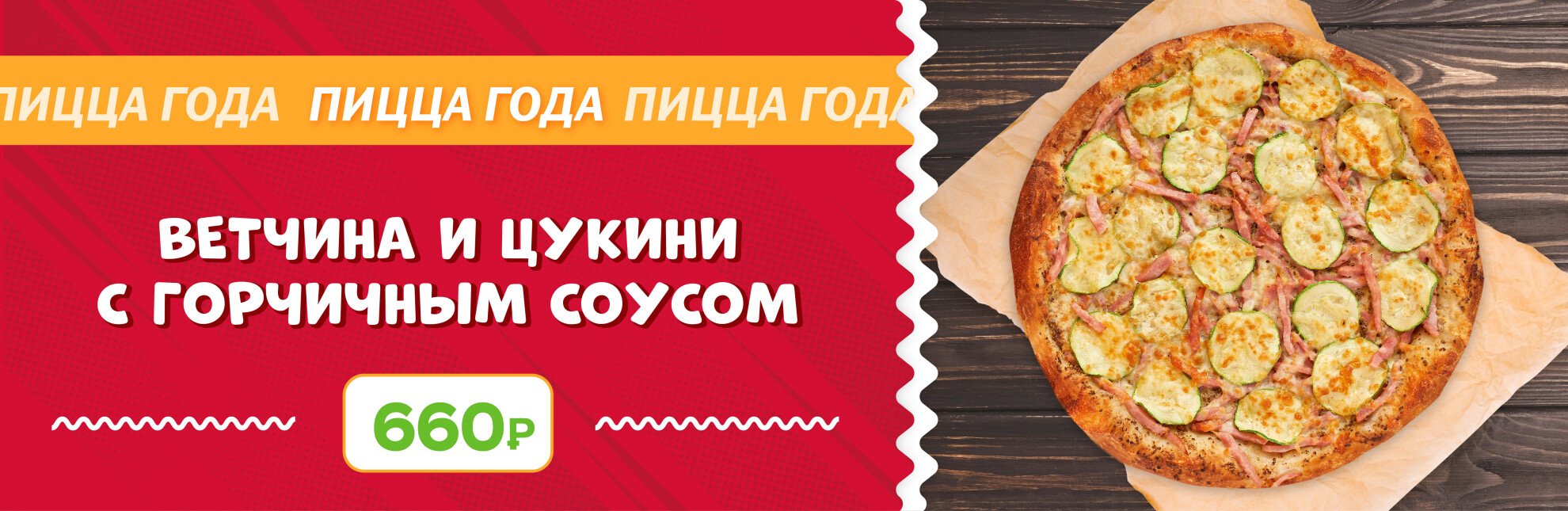 Ветчина и кольца цукини под горчичным соусом, придающем пикантный вкус, запекаются на мягком тесте под тёртым ароматным сыром моцарелла