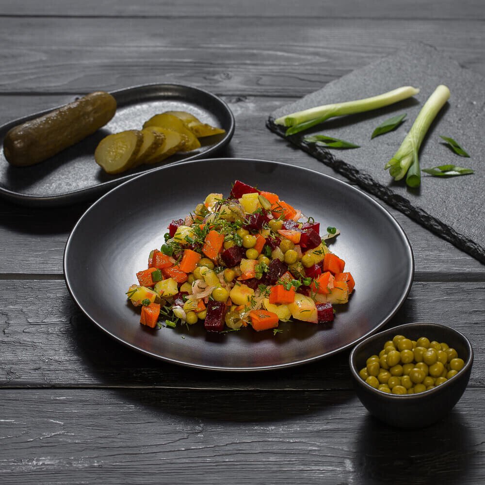 свекла, картофель, морковь, капуста квашенная, огурцы консервированные, горошек зеленый, масло растительное, зелень, соль